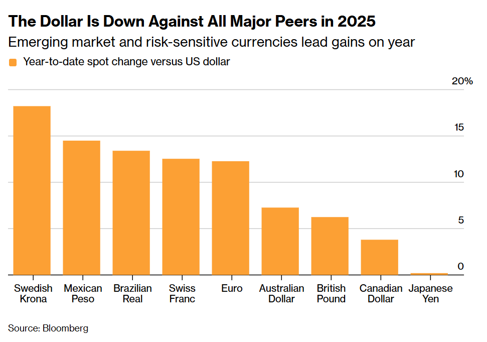 但策略师预计,2026年美元将再次走弱——因美联储继续宽松货币政策,而其他央行要么维持利率稳定,要么接近加息。这种政策分化将促使投资者抛售美国债券,将资金转移至收益率更高的国家。