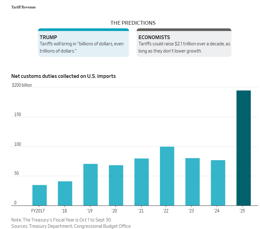 2025财年(包括特朗普的新关税和现有关税)征收的关税总额达到约1950亿美元,是前一年770亿美元的两倍多。而2024年,个人所得税收入为2.4万亿美元,约占联邦总收入的一半。