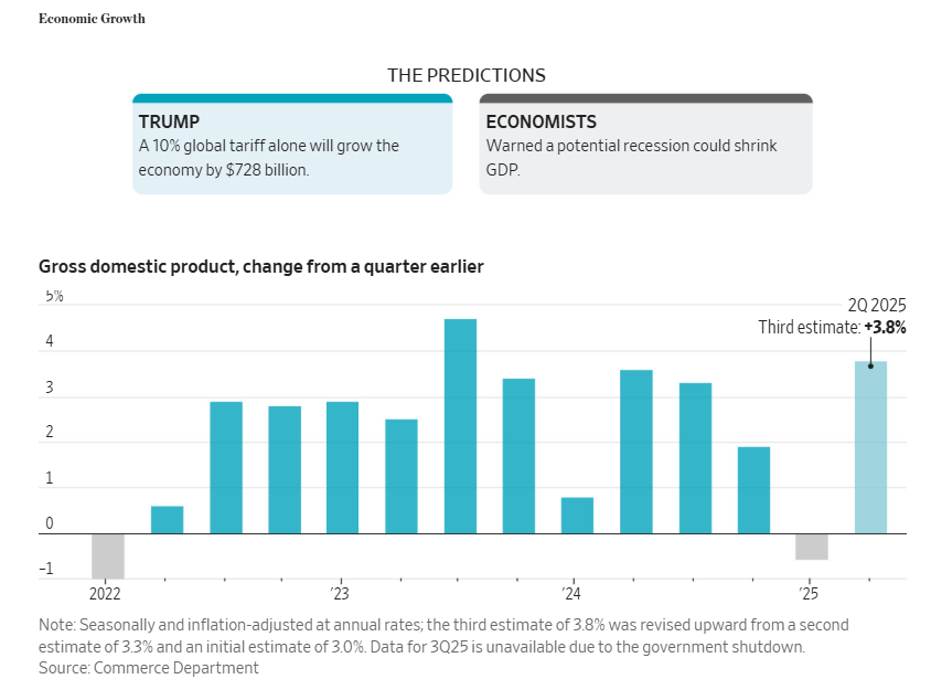 关税并未拖垮经济。事实上,第二季度GDP达到了近两年来的最强季度增长:经季节性和通胀调整后的年化增长率为3.8%。第三季度增长率紧随其后,约为3.5%。