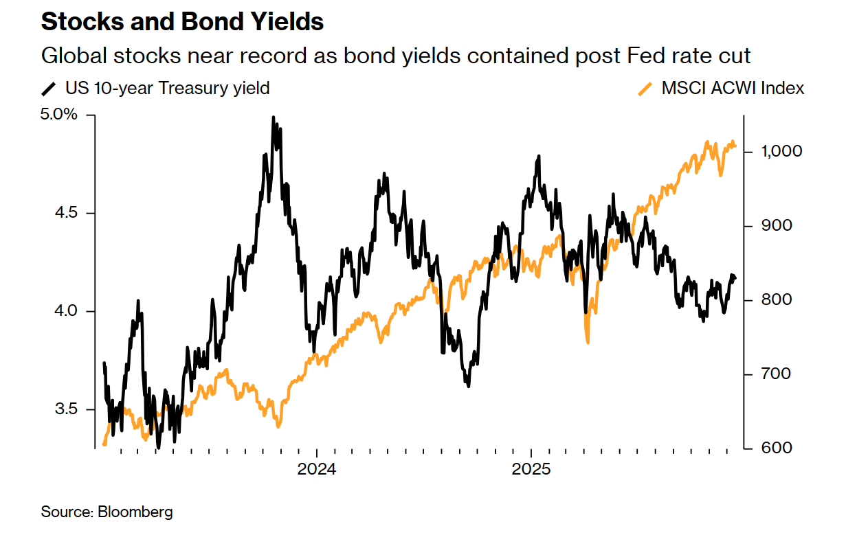 衡量全球股市最广泛指标之一的MSCI全球所有国家股票指数(MSCI All Country World Index)在美联储12月10日降息后创下历史新高。受人工智能进步带来的热情及宽松货币政策前景的共同提振,标普500指数和纳斯达克100指数在2025年均出现上涨。