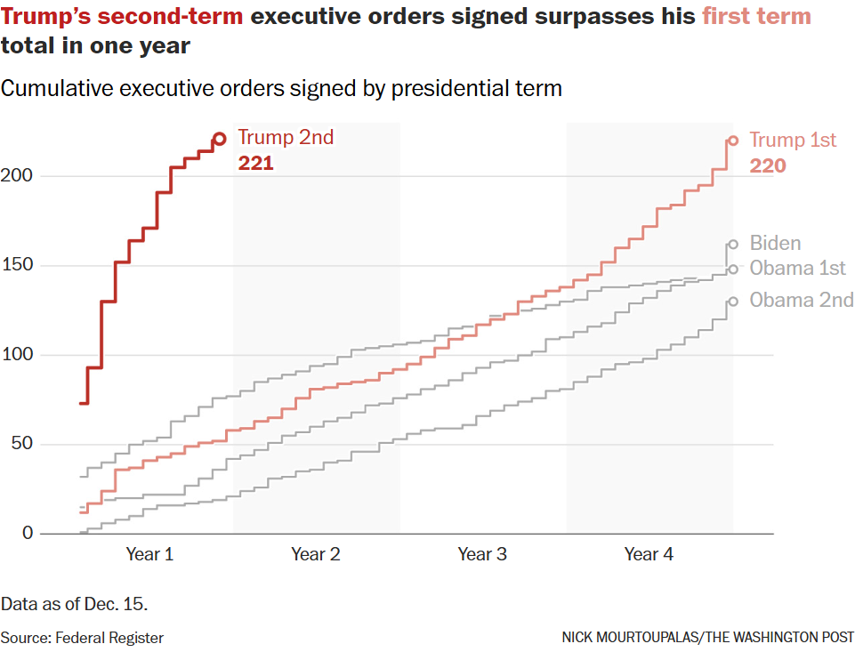 本周一,特朗普签署一项行政令,下令将芬太尼列为“大规模杀伤性武器”,这已是他第二任期内的第221道行政令。自就职以来,他凭借行政令推行大范围关税政策、报复那些他认定的政敌,还插手各类大小文化事务,上至挑战移民法,下到管控淋浴喷头的出水压力。
