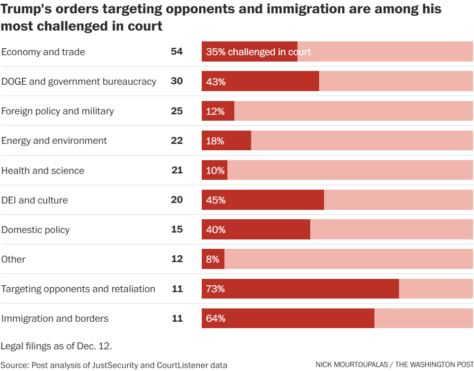 据《华盛顿邮报》依据非营利组织CourtListener与JustSecurity的数据展开分析,截至12月12日,特朗普签署的行政令中有三分之一已遭到明确的司法诉讼。