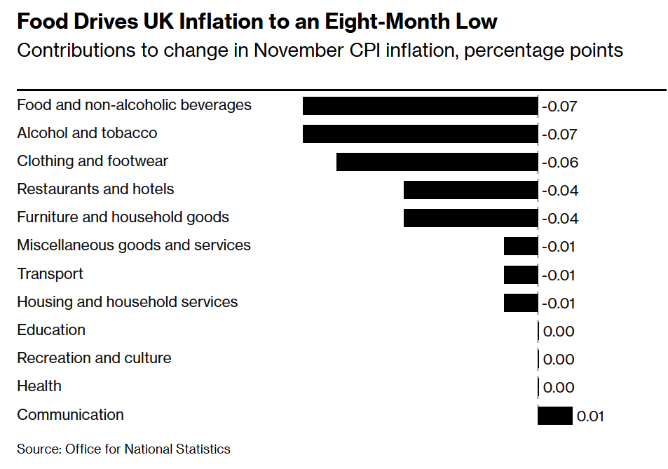 英国国家统计局(Office for National Statistics)周三公布的数据显示,11月消费者价格指数(CPI)同比仅上涨3.2%,低于10月的3.6%,蛋糕、饼干和早餐麦片等部分食品价格下跌是主要拖累因素。