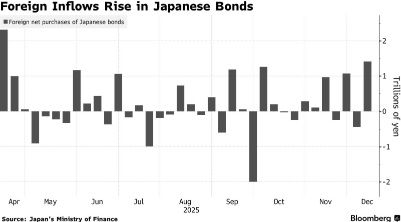 日本财务省周四公布的初步数据显示,净购买额总计达1.41万亿日元(约合91亿美元),创下自4月11日当周结束以来的最高水平。在12月11日进行的20年期日本国债拍卖中,需求同样明显,投标倍数攀升至五年高位。