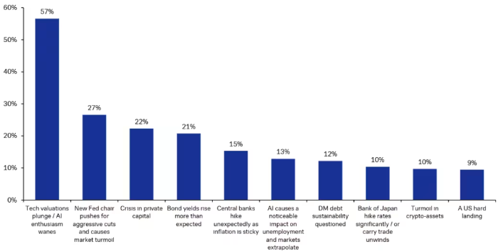 超过半数的受访者将其列为2026年的最大担忧,紧随其后的是担心新任美联储主席是否会激进降息并引发市场动荡,或者私募资本领域是否正在酝酿危机,后两者的得票率几乎相当。