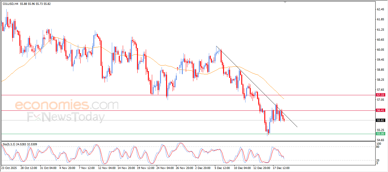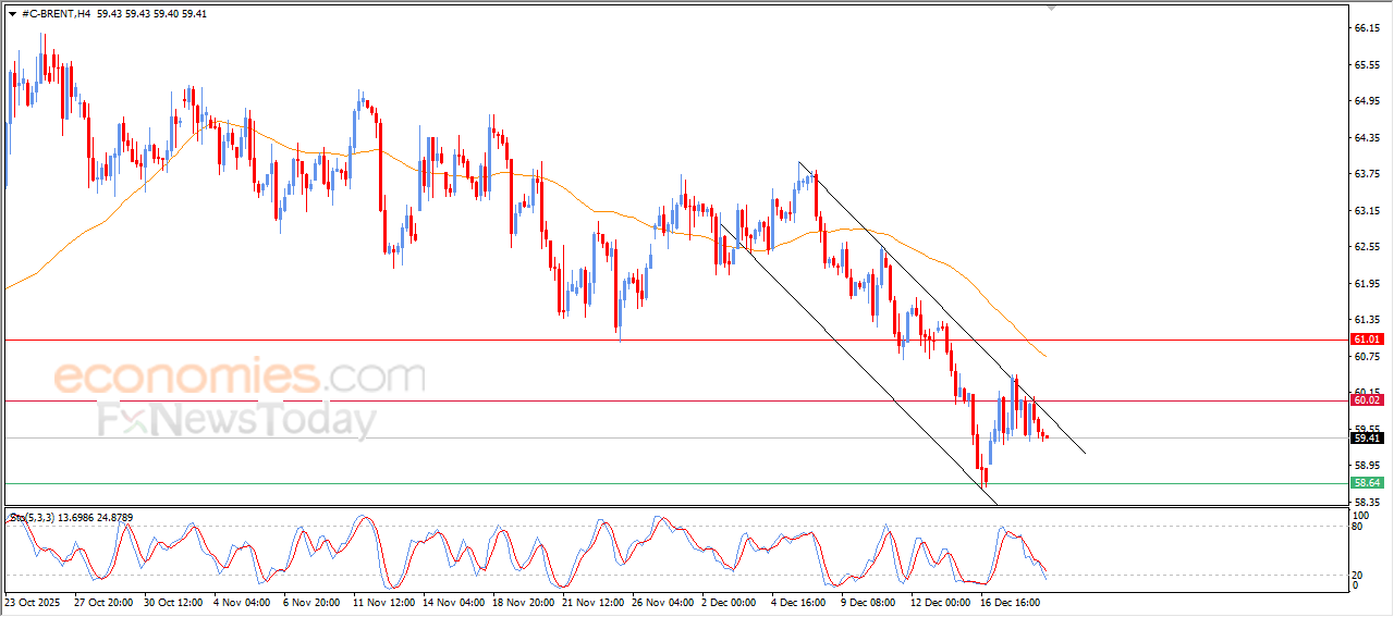 布伦特原油期货价格在上一交易日盘中出现下跌,主要由于60.00美元阻力位的稳固,加之价格持续运行在EMA50均线下方,负面压力持续增强。这进一步巩固了主要空头趋势的强度和主导地位,并降低了价格反弹的可能性,尤其是在短期内价格处于次级下行通道区间内运行的情况下。同时,相对强弱指标也出现了负面信号。