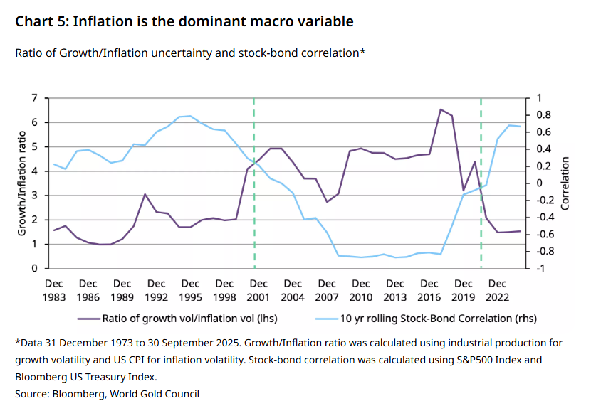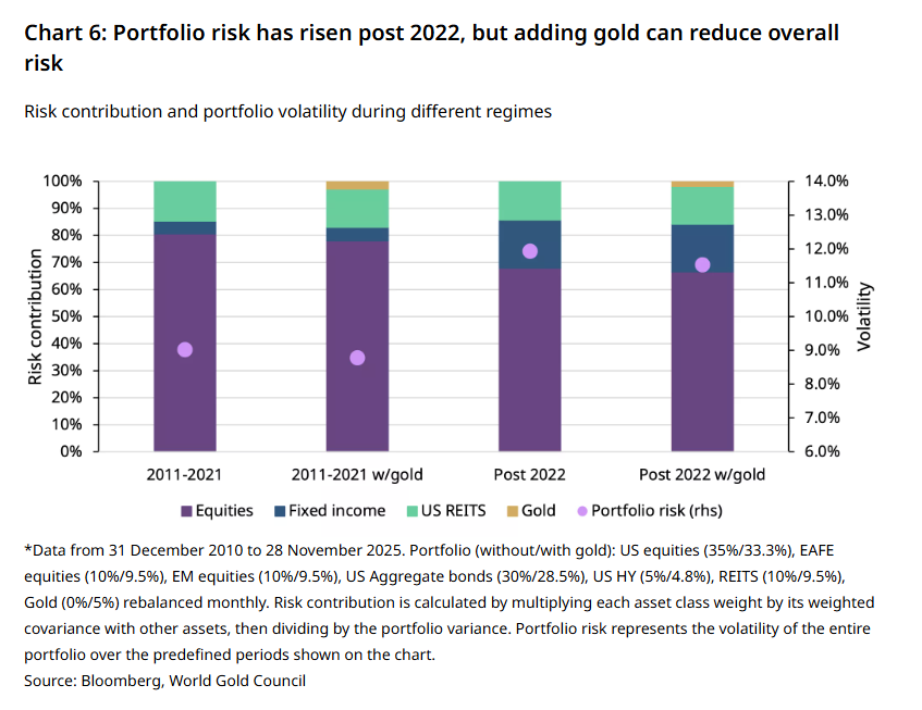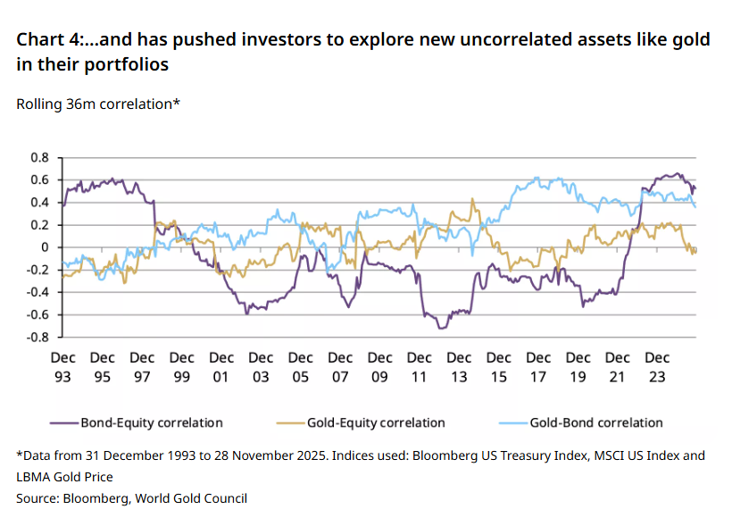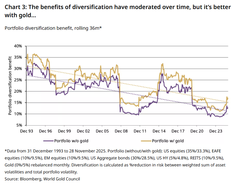 在传统多元投资收益不断减弱的背景下,黄金继续在降低整体组合风险方面发挥重要作用,进一步强化了其对寻求不确定性中稳定性的投资者的重要性。