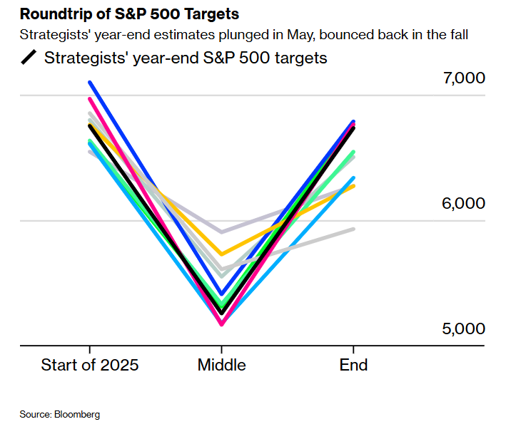 预测美国股市在任意年份的最终走向都是一项挑战,但2025年的难度更上一层楼。几乎所有华尔街大行都曾因特朗普政府全面的关税计划而下调了对标普500指数的预期。随后,当政策放松、企业盈利预期反弹且股价起飞时,它们又不得不纷纷上调目标位。