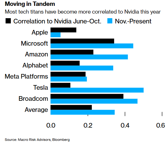 据Macro Risk Advisors创始人兼首席执行官Dean Curnutt表示,日益集中的市场面临着“自反性风险”,尤其是在少数龙头股之间关联度越来越高的情况下。他将“七巨头”科技巨头——Alphabet、亚马逊、苹果公司、Meta Platform、微软、英伟达和特斯拉——视为一个潜在的“循环收购小队”,在那里“现金只是在循环流转,创造出更多的市值增长”。