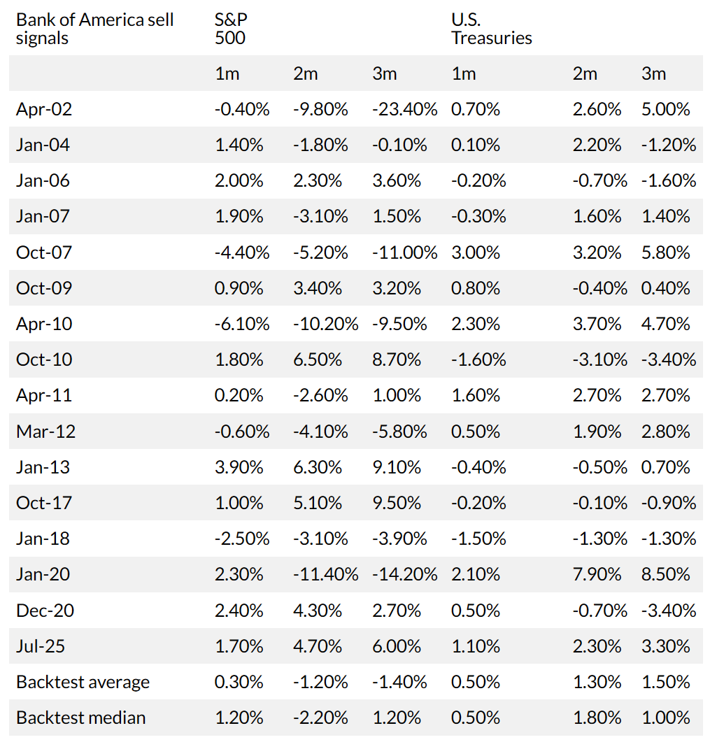 美国银行认为,任何超过8的数值都会触发“抛售信号”。自2002年以来的16次“命中”记录显示,标普500指数在随后的三个月内平均下跌1.4%。而衡量全球股市的MSCI所有国家世界指数在三个月内的平均回撤幅度更高达8.5%,且未来一个月内的最大上涨空间仅为1.7%。