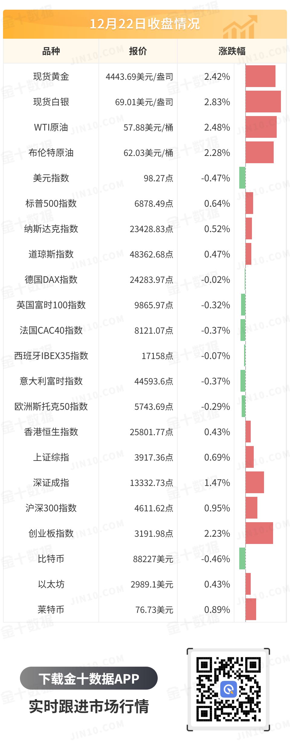 受避险资金推动,现货黄金跳涨超2%,并将历史新高刷新至4440美元上方,最终收涨2.42%,报4443.69美元/盎司;现货白银随黄金继续刷新历史新高,最终收涨2.83%,报69.01美元/盎司。铂、钯亦创阶段新高。