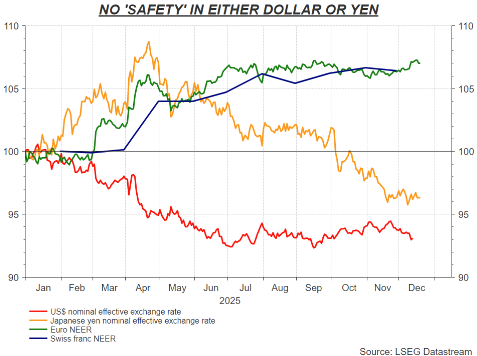 2025年上半年美元下跌,最初推动日元和瑞士法郎走高,但日元随后回吐了所有涨幅。日本央行进一步加息也未能起到提振作用,因为投资者担忧新的财政刺激措施,且新任首相高市早苗(Sanae Takaichi)上任后,日本国内债券市场也陷入动荡。