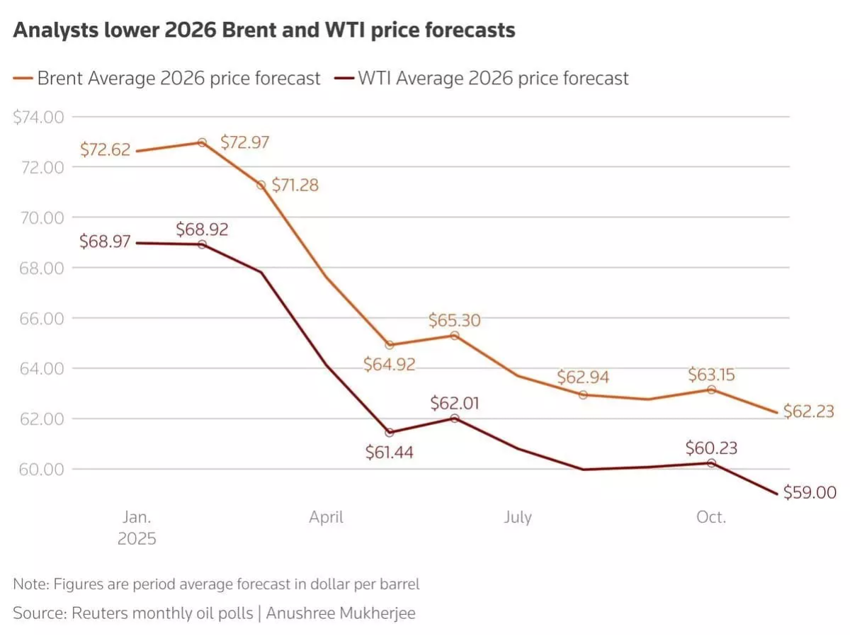 据路透社对35位分析师的最新调查,预计2026年布伦特原油均价约为62.23美元,而WTI原油均价则接近59美元。作为参考,2025年布伦特原油均价迄今为68.80美元。