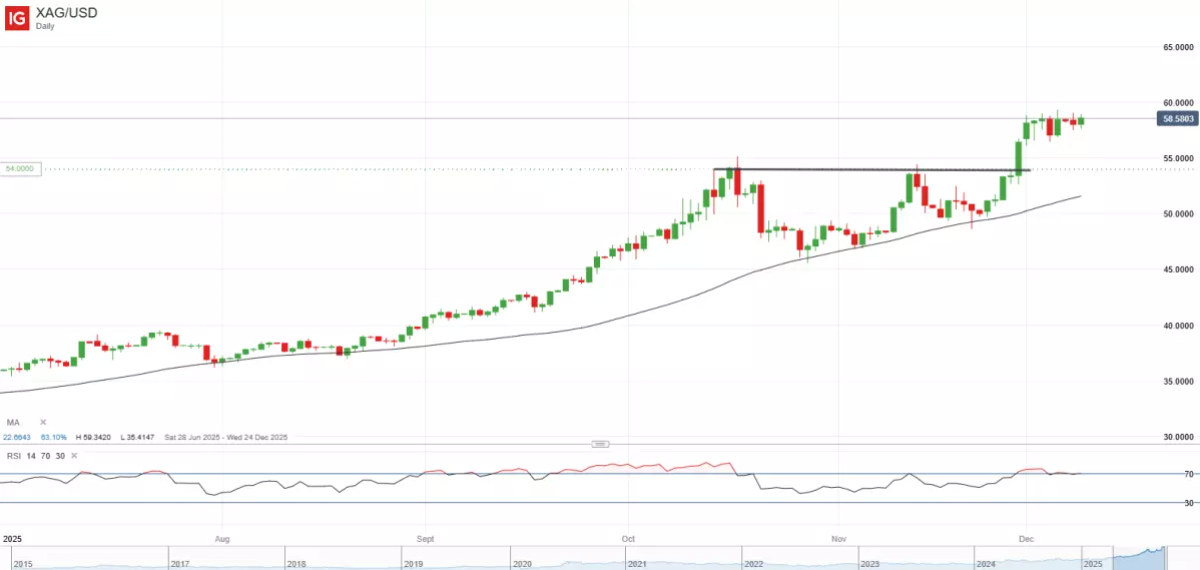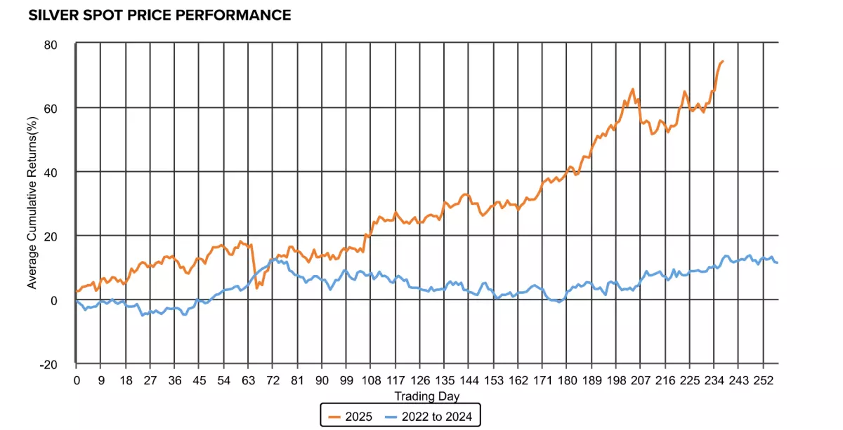 说实话,这种转变并非凭空出现。2025年是市场性质发生改变的一年。从累计表现来看,白银突然摆脱了2022-2024年的震荡整理格局,开始展现趋势强度:低点不断抬高,动能稳步积累。
