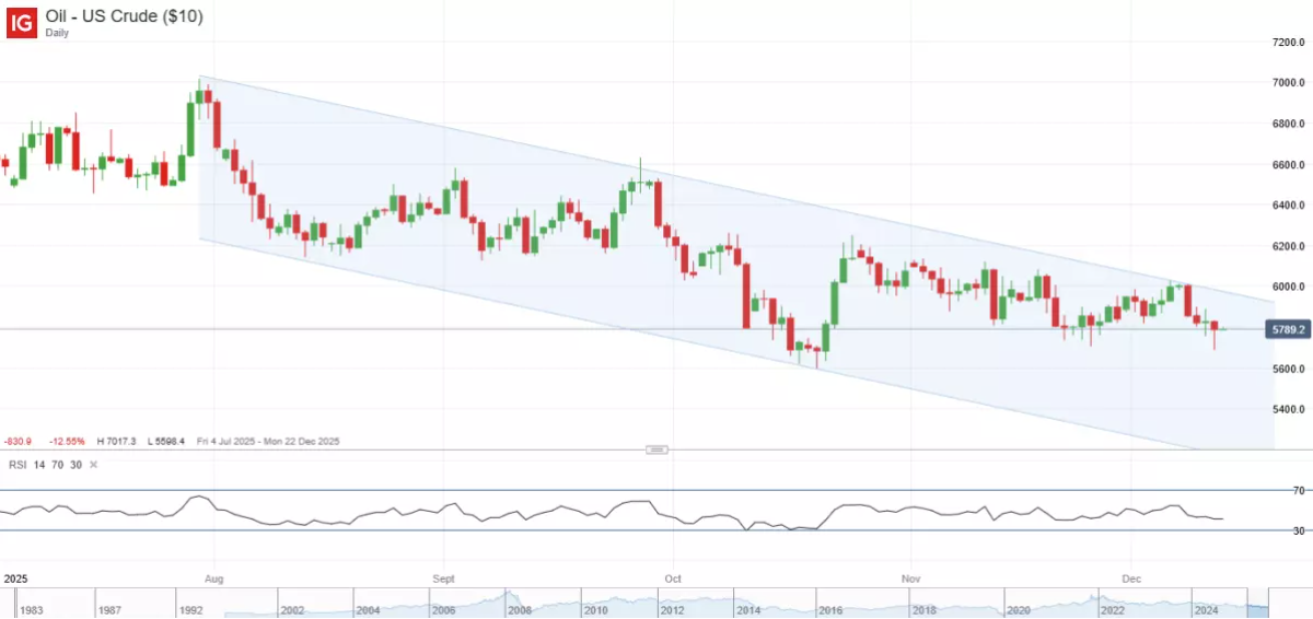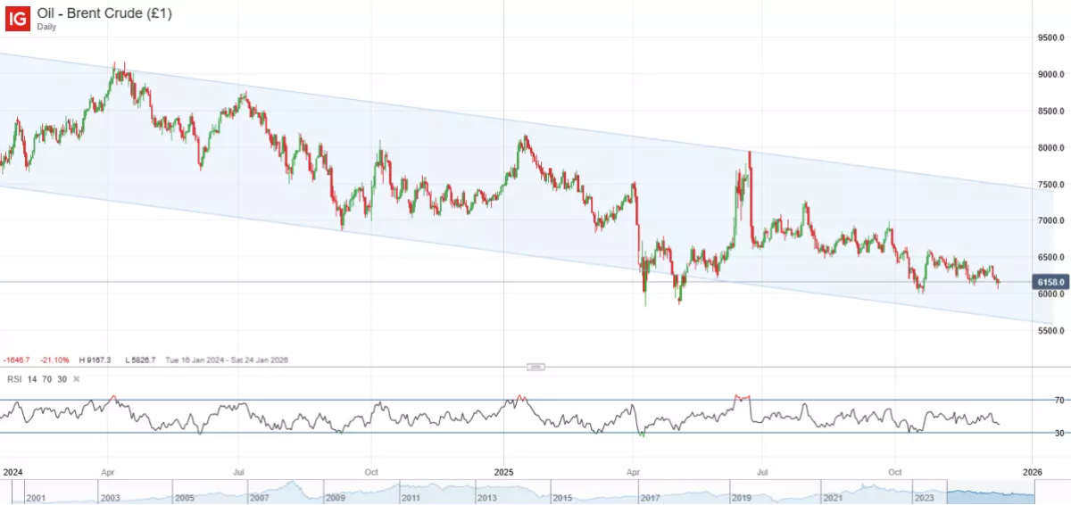 从技术分析角度来看,布伦特原油和WTI原油自2025年初以来一直处于持续的下降通道中,这印证了结构性熊市趋势,而非短期回调。每次反弹均在更低的高点受阻,支撑位则持续失守,强化了卖方主导市场的观点。
