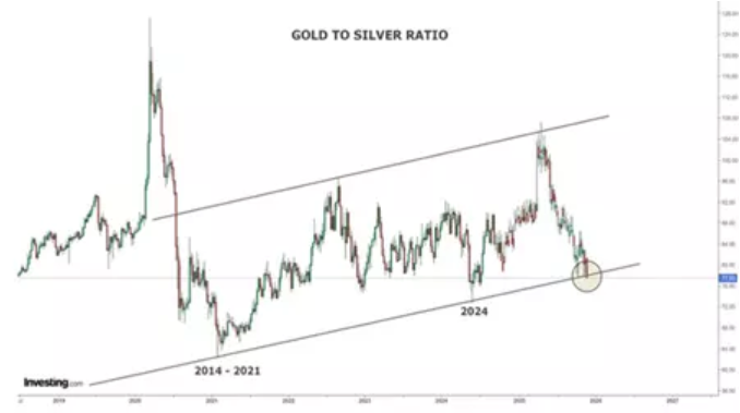 金银比已回落至长期支撑趋势线——历史上,白银在此区间开始大幅跑赢黄金。