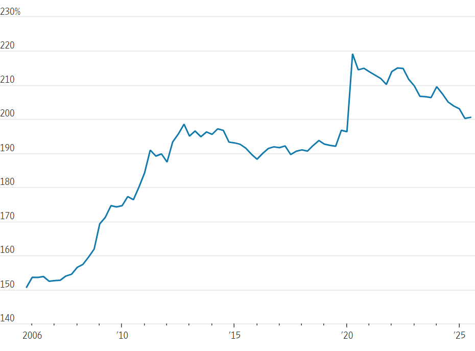 最令人担忧的仍是日本众所周知的高债务负担。其公共债务总额高达国内生产总值(GDP)的200%。此外,受日本央行紧缩政策与财政刺激支出影响,日本国债收益率持续攀升。