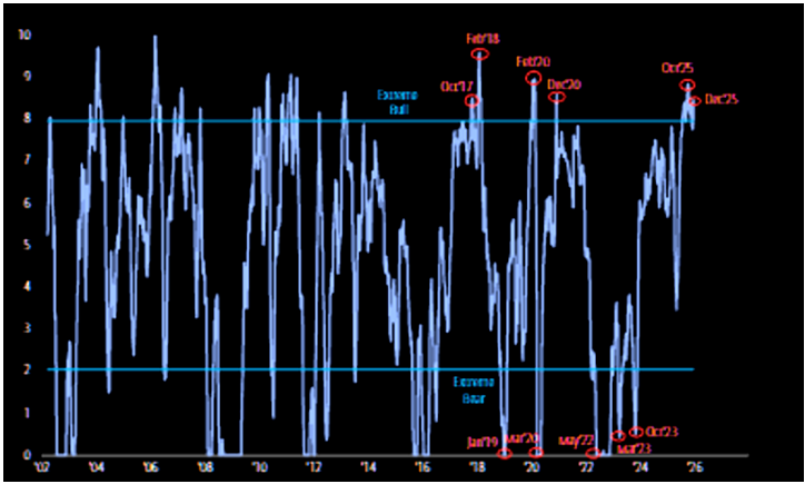 美银反向卖出信号已被触发。自2002年以来,该信号共出现16次,其后两个月全球股市平均下跌2.7%,信号命中率达63%。历史回测显示,触发后典型回撤幅度为:一个月内约4%,两个月内约6%,三个月内约9%,而潜在上行空间损失始终低于2%。