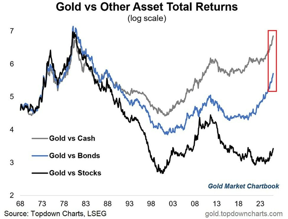 这一系列相对价格的突破,伴随着黄金现货价格在过去两年内飙涨119%,首次突破4500美元/盎司。同期对比数据显示:现金回报率+9.7%,债券回报率-4.0%,标普500指数上涨+45%。