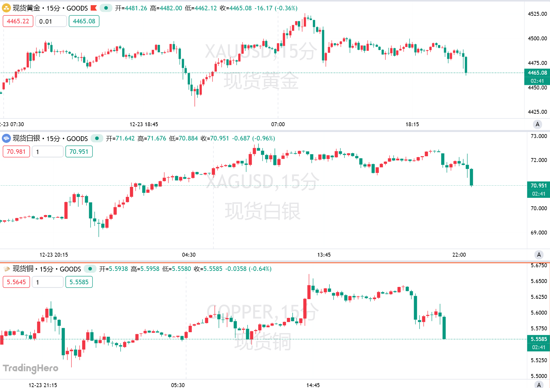 不过,截止发稿,金银铜价格均有所回落。国际现货黄金短线跌幅扩大至20美元,最低触及4462.12美元/盎司。国际现货白银、纽约期银均跌破71美元/盎司。