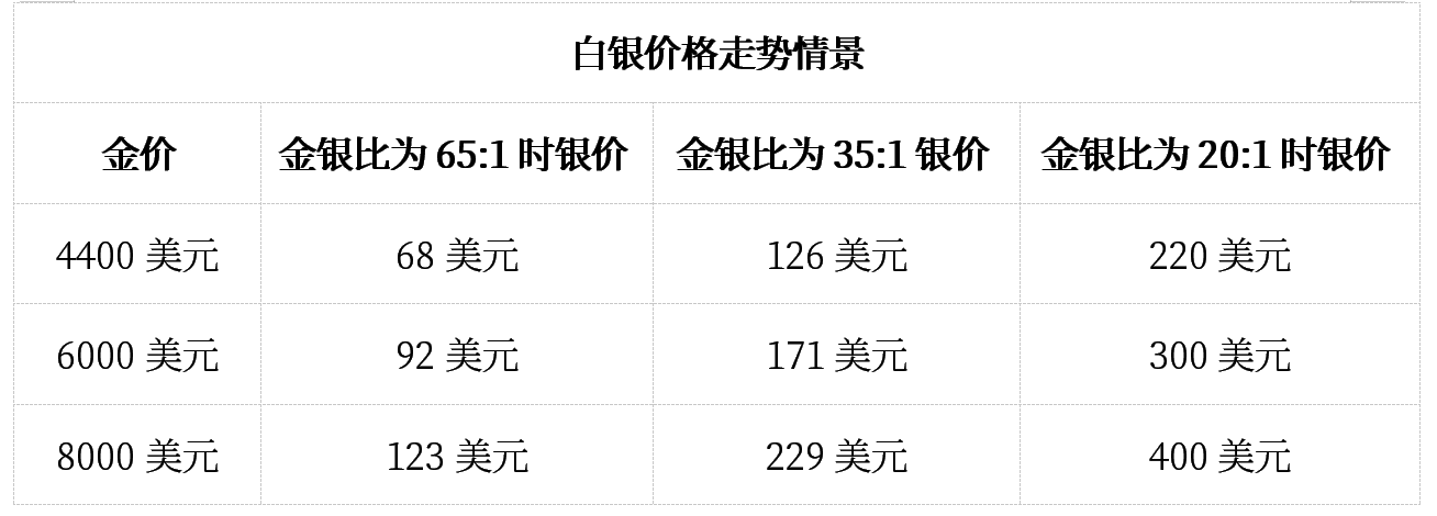 黄金价格向每盎司6000至8000美元的潜在走势,为白银价格达到三位数提供了数学模型支撑。结合历史金银比分析,这些模型表明白银的升值潜力将远超黄金。从金银比潜在变动逆推银价的情景分析如下: