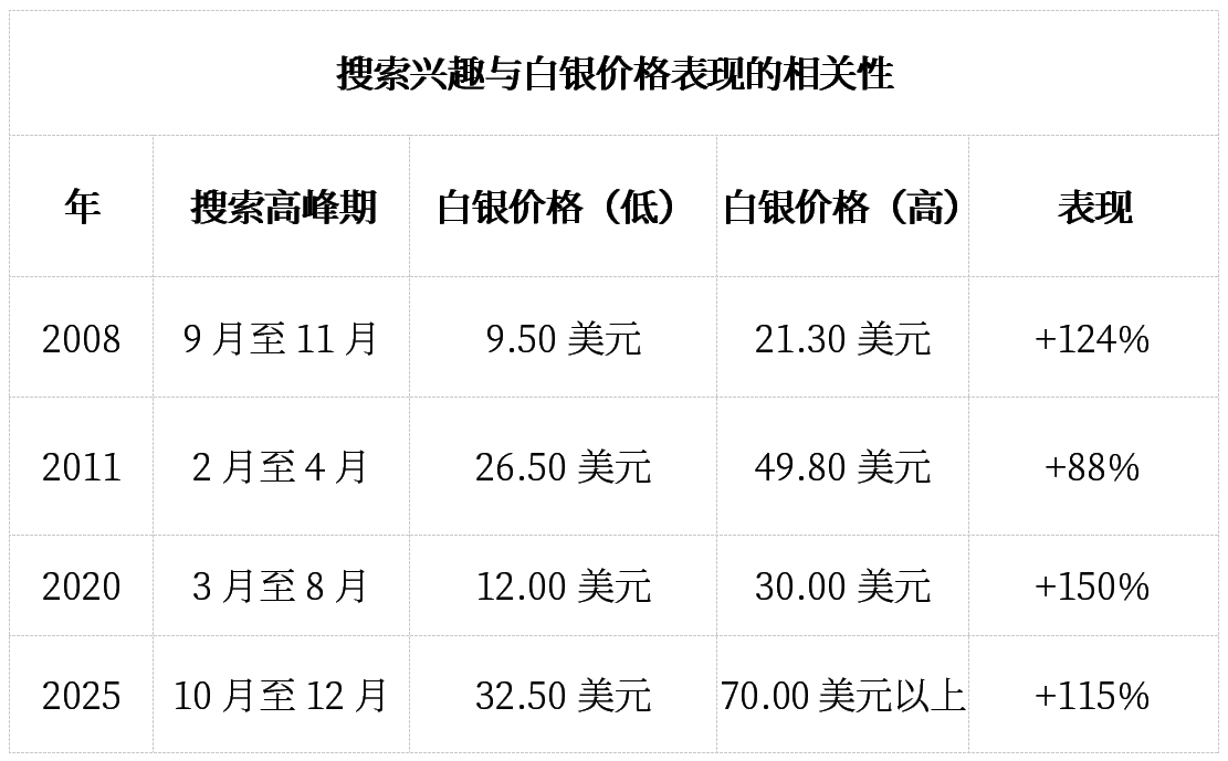 谷歌趋势数据显示,贵金属搜索词的搜索量激增与价格重大转折点之间存在相关性。例如,“如何购买白银”这一搜索词在2025年12月达到了历史最高水平,而这与历史上重要的市场转折点相吻合。
