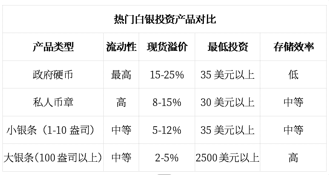 银币流动性更高,更具识别优势,而银条则能为大额投资提供更低的溢价成本。政府铸造的银币具有法定货币地位,提供额外的真伪保证。