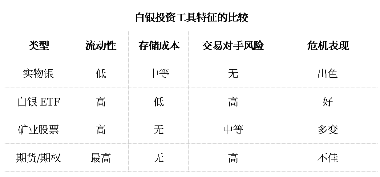 持有实物白银可直接获得投资机会,且无需承担交易对手风险;而ETF和矿业股票在正常市场环境下则具有流动性优势。然而,危机时期供应短缺可能导致实物白银价格出现显著溢价。