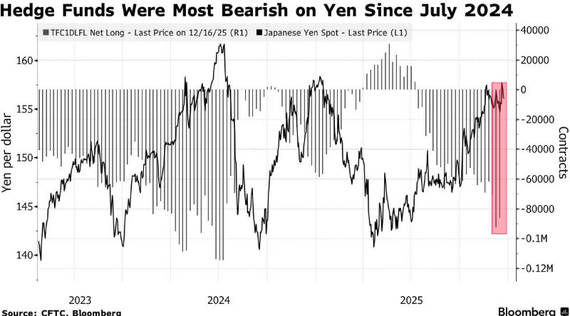 套利交易的重新抬头也构成了阻力。借入低收益日元以投资于巴西雷亚尔或土耳其里拉等高收益货币的流行策略,使得日元反弹更为困难。根据商品期货交易委员会的数据,截至12月9日当周,杠杆基金对日元的看空情绪为2024年7月以来最甚,并在接下来一周大体维持了这些头寸。