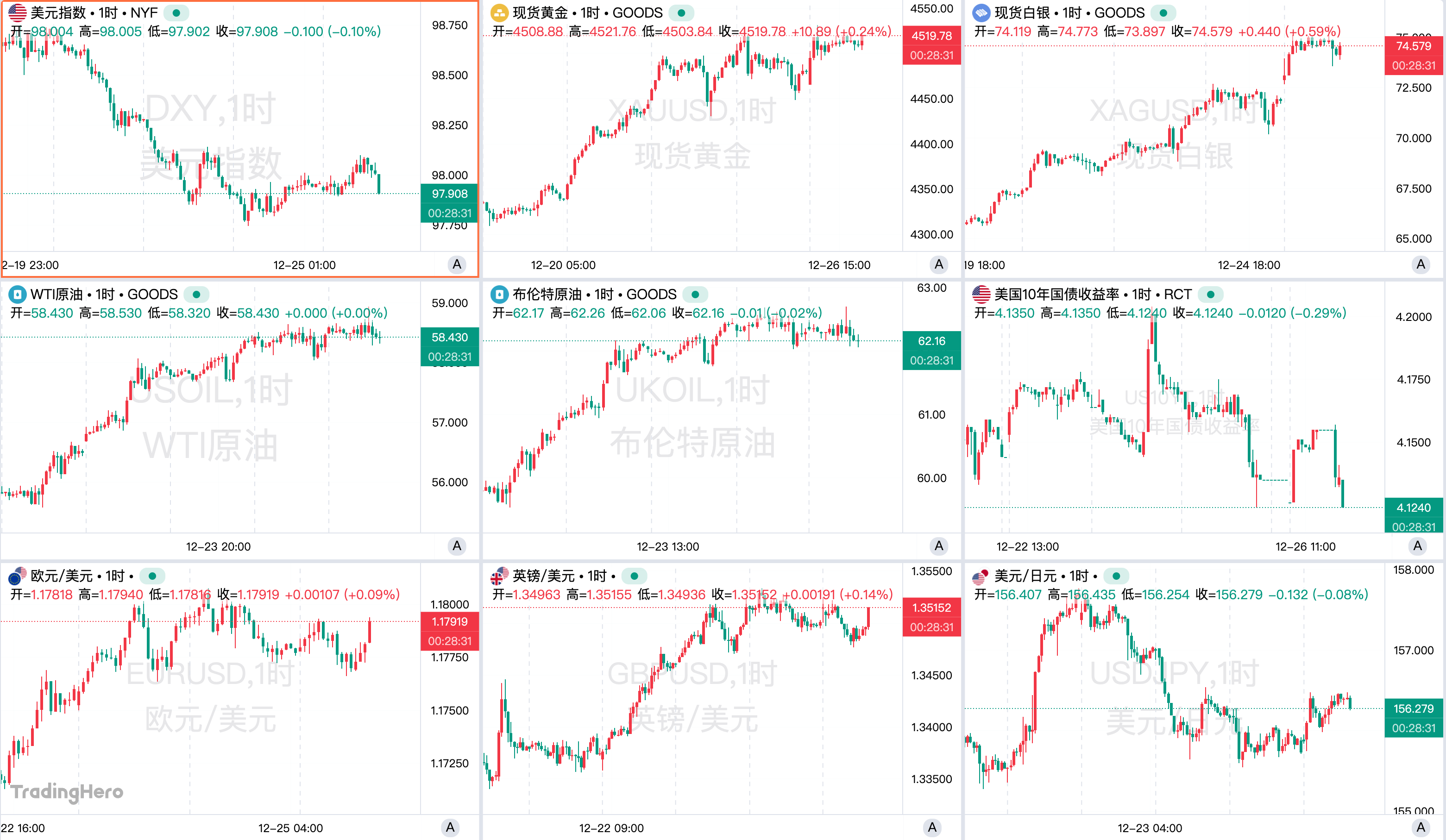 美股方面,三大股指整体延续震荡上行走势,“圣诞行情”如期而至。标普500指数在周二、周三先后刷新收盘新高。个股层面分化明显,芯片与部分大型科技股表现强势,而个别高波动股票出现明显回调。随后受圣诞假期影响,成交清淡但指数仍维持强势格局。