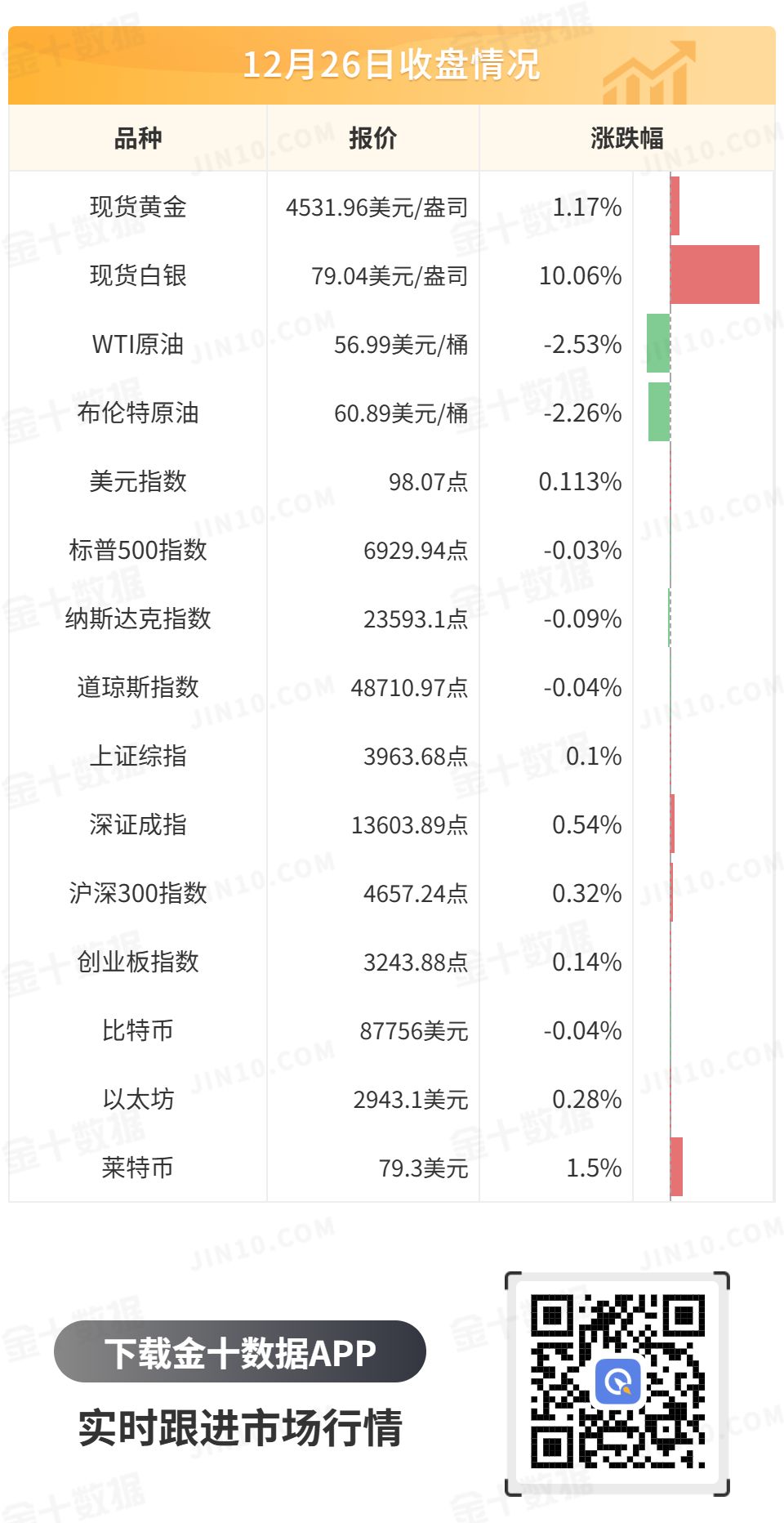 贵金属集体暴走。现货黄金一度接近4550美元/盎司,再创历史新高,最终收涨1.17%,报4531.96美元/盎司;现货白银涨势更加凶猛,美盘时段一路高歌,最终收涨10.06%,报79.04美元/盎司,同样刷新历史高位。现货铂金上涨8.75%至2435.60美元/盎司,创历史新高。
