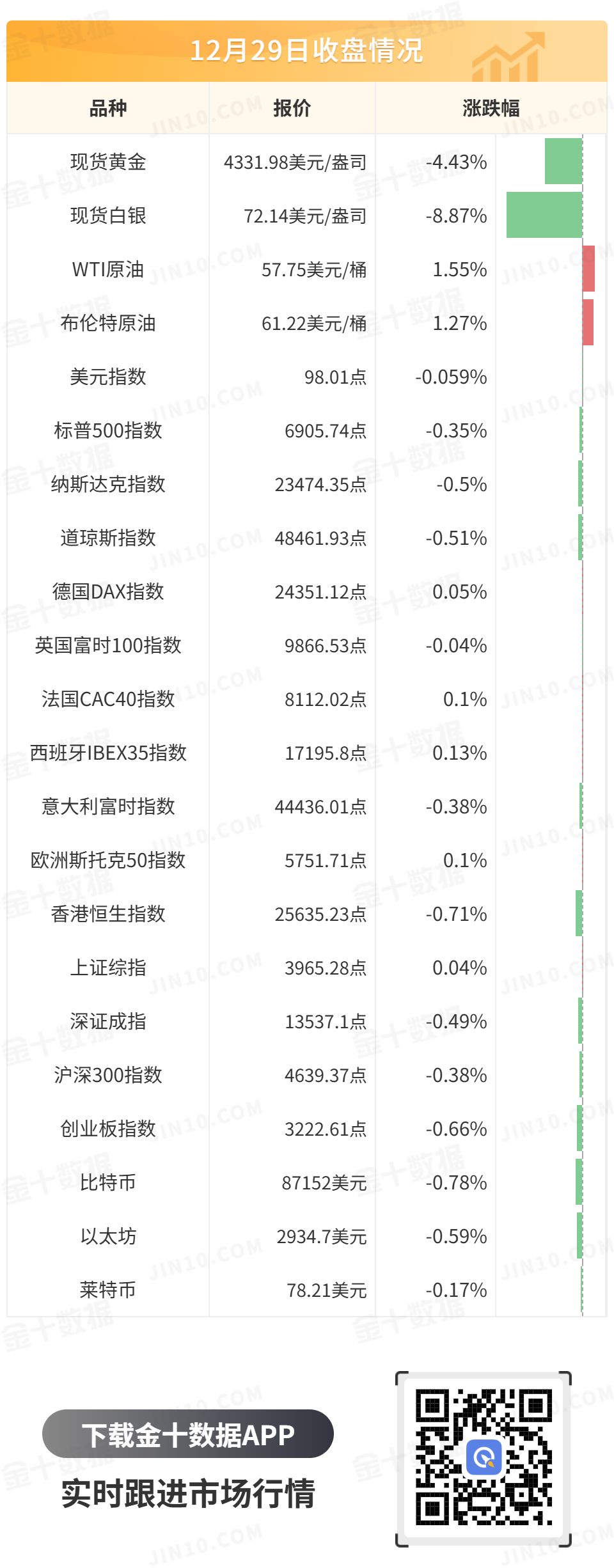 现货黄金冲高回落,日内重挫200美元,最终收跌4.43%,报4331.98美元/盎司;现货白银上演过山车行情,早盘将历史高位刷新至83美元/盎司以上,随后持续下挫,日内跌幅一度扩大至10%,最终收跌8.87%,报72.14美元/盎司。