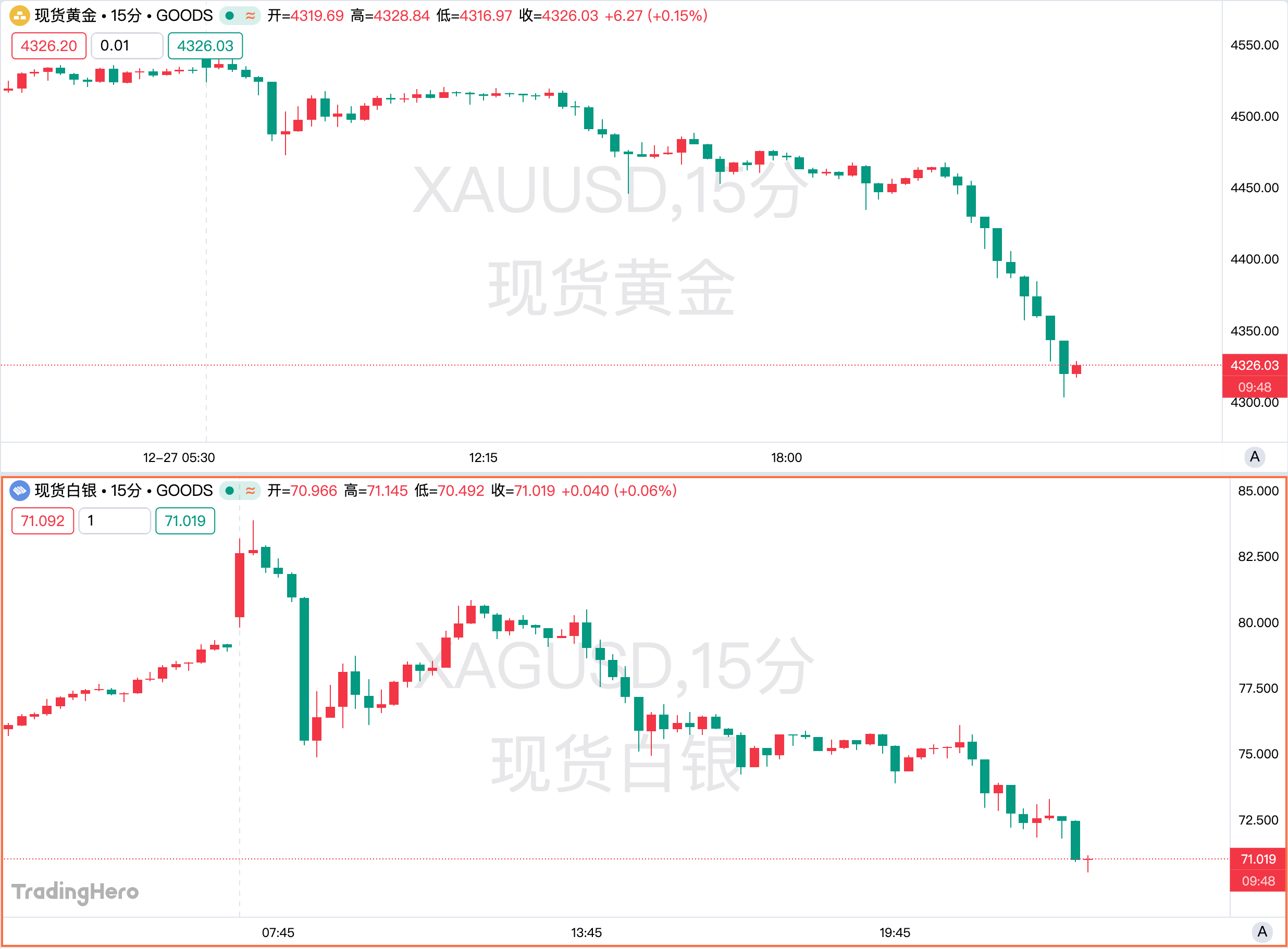 截至周一美盘,现货黄金日内重挫超200美元,现货白银日内重挫10.00%。地缘政治风险降低抑制了避险资金流入,投资者获利了结。