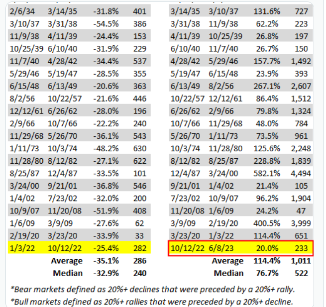 2023年6月,在标普500指数从2022年熊市低点反弹超过20%并正式进入新一轮牛市后不久,Bespoke Investment Group的分析师在X上发布了一组数据,他们比较了近94年来标普500指数每一次牛市和熊市的持续时间。