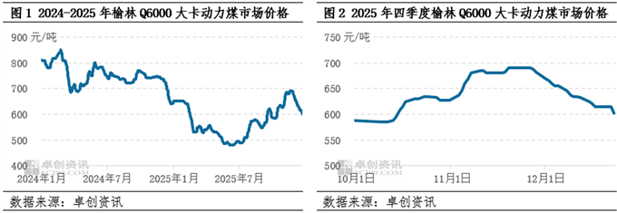 2025年四季度国内动力煤市场整体先涨后跌,价格最高点达到年内最高水平。以榆林地区Q6000大卡动力煤为例,截至12月23日主流坑口价格在595-610元/吨,较三季度末上涨15元/吨,涨幅在2.55%;四季度均价在645.7元/吨,较三季度上涨92.4元/吨,涨幅在16.70%;价格最高点出现在11月下旬为680-700元/吨,同时为2025年内价格最高点,最低点出现在10月上旬为580-590元/吨,价格振幅在17.95%。