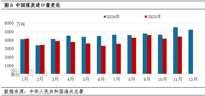 四季度以来,国内进口煤数量继续保持在年内相对高位水平,主要受两方面因素影响,具体来看:一方面,四季度正值我国迎峰度冬用煤高峰季期间,电厂耗煤量增长,对进口煤需求有增;另一方面,进口煤价格较同热值内贸煤价格仍存在一定性价比优势,国内用煤企业在采购时优先选择性价比更高的进口煤源,以Q3800大卡印尼煤价格为例,截至12月22日,四季度印尼Q3800大卡动力煤较同热值内贸煤平均价格差异为63.42元/吨,较二季度平均价格差异扩大13元/吨。因此双重因素影响下,四季度以来国内煤炭进口量继续保持在年内相对高位水平,据中华人民共和国海关总署数据显示,2025年11月煤炭进口量为4405.34万吨,暂位于年内第二高位水平。