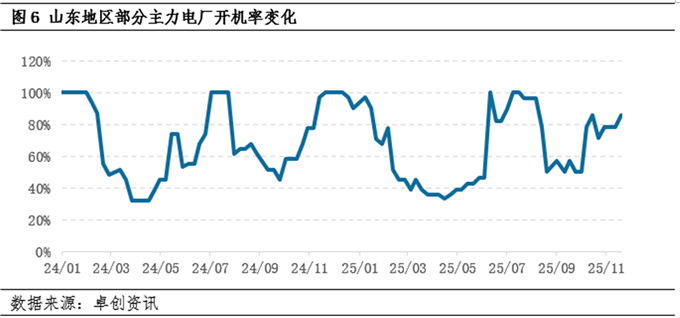 四季度需求端对市场支撑强度先强后明显减弱,具体来看:11月中旬之前,由于恰逢国内迎峰度冬用煤高峰季补库阶段,电力行业提库需求持续释放,对高价接受度也有所提升,非电行业则满足刚需为主,而由于市场价格整体偏强,贸易商在买涨不买跌情绪带动下,对迎峰度冬期间行情信心充足,投机囤煤需求较多,需求端对市场存在明显支撑,煤价持续上涨,不断刷新年内新高;而进入11月下旬后,由于煤价刷新年内新高后,增加下游对高价的抵触情绪,同时市场预期的“冷冬”天气并未出现,且局部区域较去年同期气温偏高,电厂负荷提升迟缓,电厂库存累积较快,贸易商认为高价可持续性不强,去库锁定利润需求不断增长,需求端对市场支撑减弱,煤价承压松动,同时港口、坑口煤价联动下行,且降幅较大,更加重市场参与者观望情绪,市场成交更显冷清。据卓创资讯统计数据显示,截至12月18日,山东地区主流电厂开机率为85.71%,较去年同期开机率低14.29个百分点。
