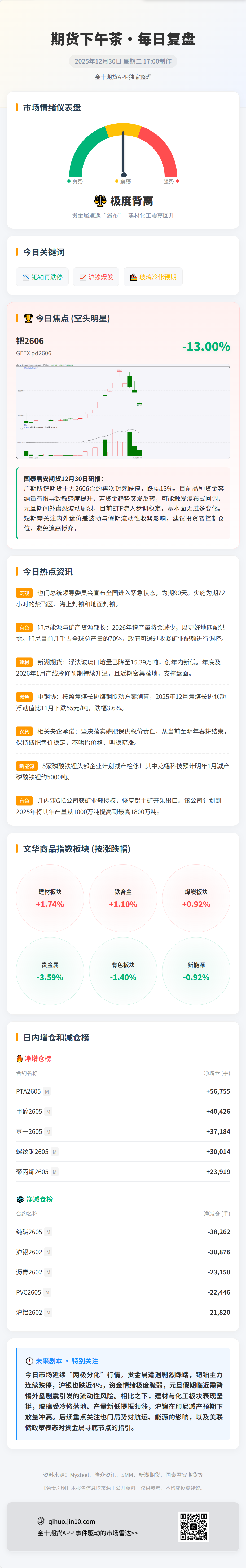 国泰君安期货表示,铂钯价格出现回撤,截至收盘,广期所铂钯各合约均已跌停。欧美盘铂钯继续跟随白银深跌,核心驱动源于欧美盘资金动向与内盘元旦假期前的避险操作:前期获利资金借欧美盘流动性窗口入场兑现收益,叠加假期临近主力抽离部分资金,对于前期的快速上涨进行了一定修正,形成技术性回调,铂金技术形态健康,目前暂未打破市场核心逻辑;钯金撤步明显,技术面上目前已跌破20日均线,叠加多头情绪显著放缓,恐和铂金走出进一步的分化。目前铂钯在贵金属大趋势下无法走出自己的行情,下方寻找到支撑的节点需关注白银探底回弹节点。目前高位波动显著加剧,品种资金容纳量有限导致敏感度提升。若资金趋势突发反转,可能触发瀑布式回调,元旦期间外盘恐波动剧烈。目前现货结构性矛盾存在但并未边际变紧,ETF流入步调稳定,基本面和宏观面并没有过多的变化,故前期追踪的高频数据目前已不能支撑预测趋势反转的精准节点。短期需关注内外盘价差波动与假期流动性收紧影响,建议投资者控制仓位、设置严格止盈止损,避免追高博弈。