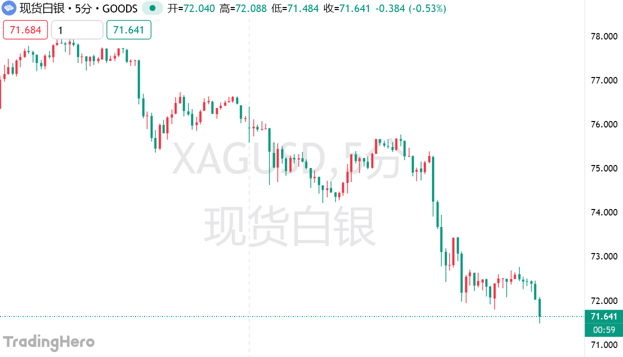 现货白银周二曾大幅反弹收复周一的大部分跌幅,但周三再度上演跳水行情,最低跌破72美元关口,截至发稿报71.58美元/盎司,日内跌幅超6%。