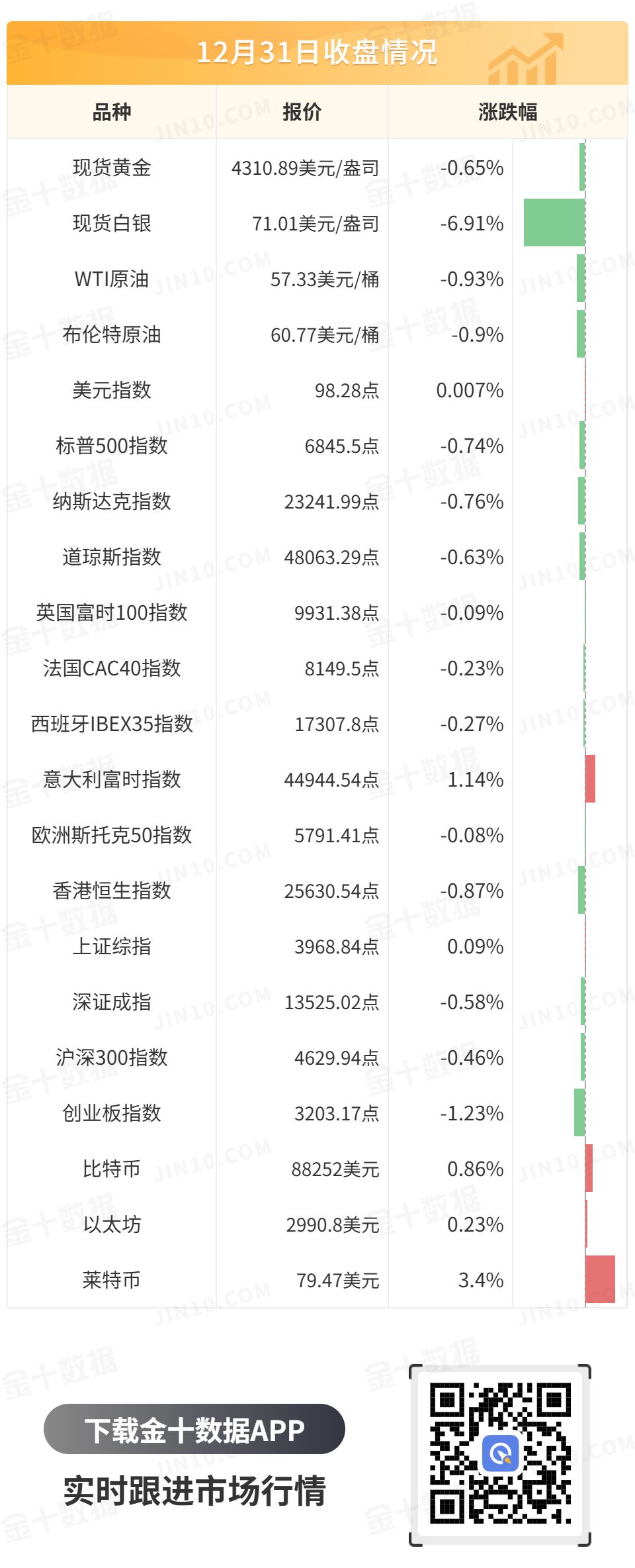 由于投资者在见证贵金属历史性的年度上涨后获利了结,且芝商所再次上调保证金,现货黄金重回跌势,最低触及4274.34美元/盎司,随后跌幅有所收窄,最终收跌0.65%,报4310.89美元/盎司,2025年大涨约64%,为连续第三年上涨;现货白银回调更加猛烈,盘中跌超7%,最终收跌6.91%,报71.01美元/盎司,全年大涨147%。两者均创下1979年以来的最佳年度表现。现货铂金全年大涨128%,现货钯金大涨77%。