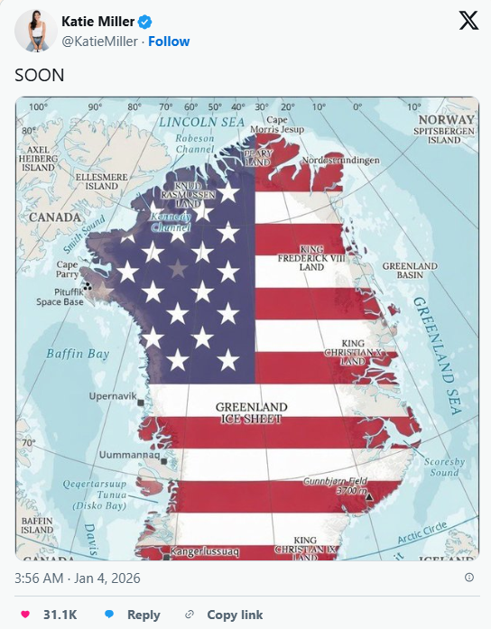 在华盛顿对委内瑞拉进行军事干预后,关于美国下一步可能将注意力转向何处的猜测达到了白热化,特朗普最亲密的顾问之一的妻子在X上发布了一张带有美国国旗的格陵兰岛地图,并附有唯一一个词“很快”。
