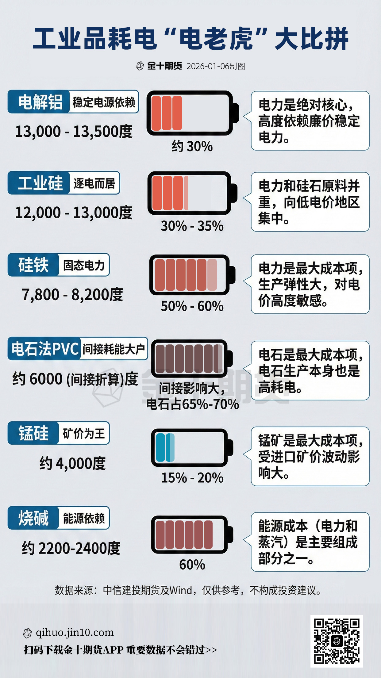 硅铁电费占比高达60%,被称为“固态电力”;电解铝单吨耗电超1.3万度。盘点6大高耗能品种的能耗账单,理清成本端交易逻辑。