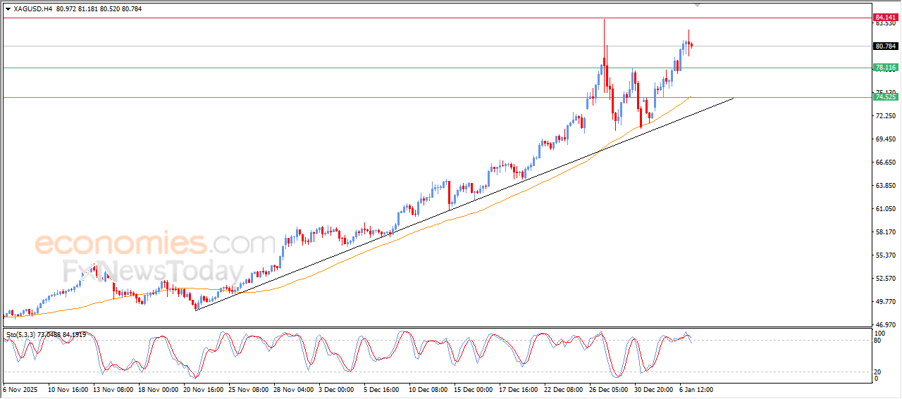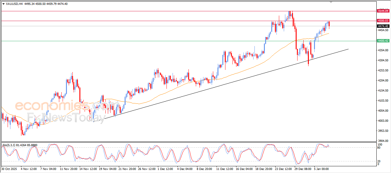 国际现货黄金在近期日内交易中下跌,受到4500美元主要阻力位的稳定影响,该阻力位是我们之前分析中预期的目标位,黄金进入回调区间,试图获得上涨动能。短期内,价格在主要上涨趋势的主导下运行,沿着该趋势线的支撑线交易,并且高于EMA50,提供了关键的动态支撑。然而,相对强弱指标上开始出现负面重叠信号,表明正在形成负面背离,这可能会在日内引发看跌的修正性反弹。