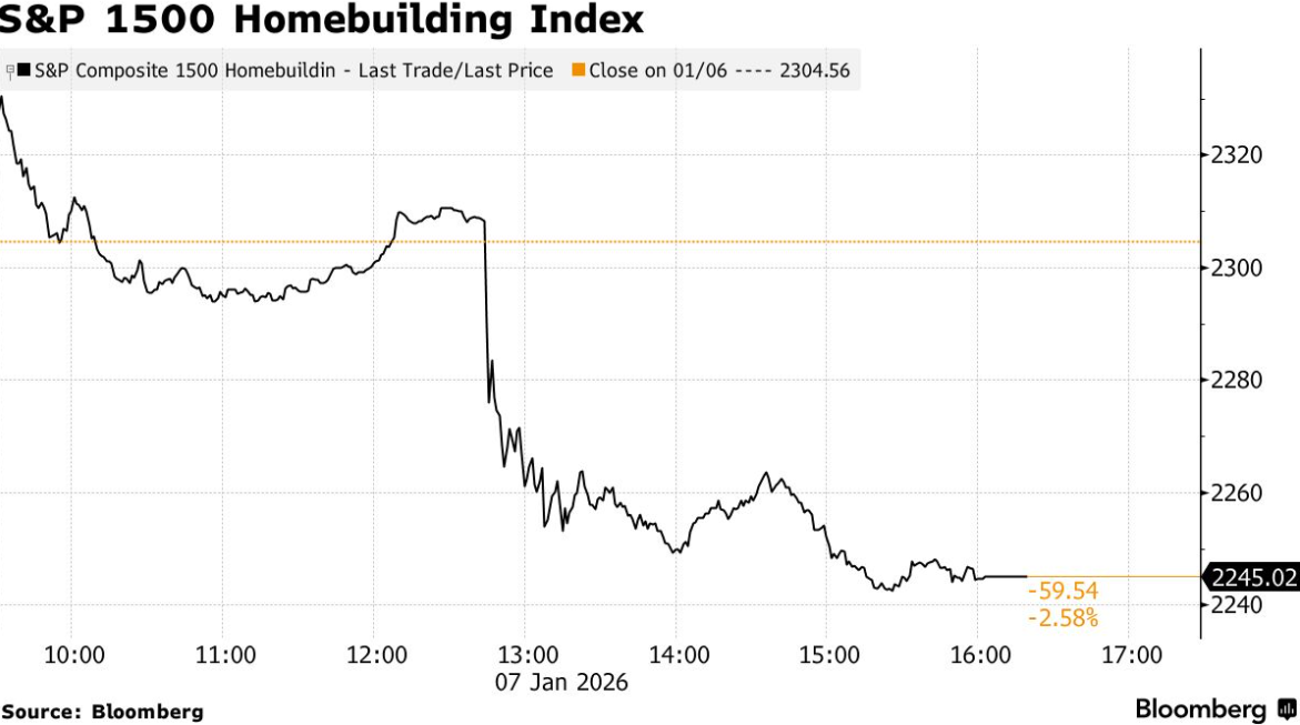 这一消息导致标普1500住宅建筑指数下跌近2.6%,包括托尔兄弟公司(Toll Brothers Inc.)、邀请之家公司(Invitation Homes Inc.)、KB Home和普尔特集团(PulteGroup Inc.)在内的住宅建筑商股价全线下跌。作为美国独栋住宅的主要投资者,黑石集团(Blackstone Inc.)股价一度大跌9.3%,随后收复部分失地。