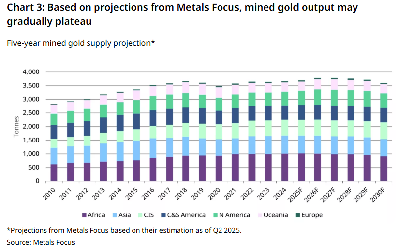 即便如此,结合Metals Focus咨询公司的分析与预测数据,世界黄金协会分析师认为未来几年全球金矿产量不会出现“见顶回落”的走势,而是更有可能逐步进入平台期(见图3)。虽然新项目投产与产能爬坡将持续为产量提供支撑,但金矿储量下降、各类运营扰动以及金矿企业资本开支成本高企等因素,均会限制产量的上行潜力。