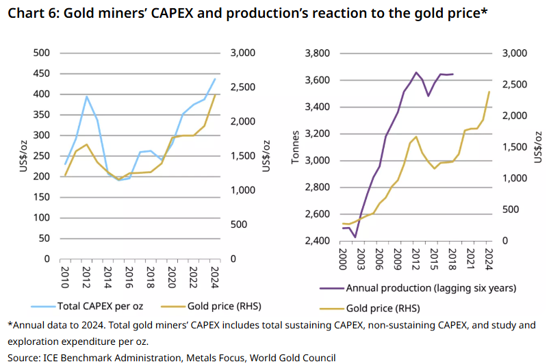 尽管老旧金矿复产与个体及小型金矿增产能够快速提振黄金产量,但正如前文所述,新金矿项目从启动到投产耗时漫长,且实施难度较大。世界黄金协会的研究发现,金价上涨通常会在同年带动矿企资本开支增加,但金矿产量对金价上涨的反应存在至少6年的滞后效应(见图6)。