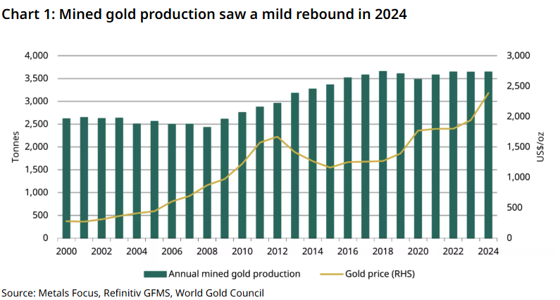 近年来,全球金矿开采量始终保持稳定态势。尽管受到疫情、停产整顿以及劳工运动等短期因素冲击,但2018年至2024年间,全球金矿年产量的同比变动幅度均值几乎为零。