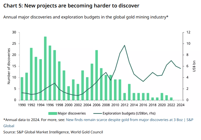 第二,金矿开采项目的建设周期较长,矿企难以在短期内快速增减产量。与此同时,新金矿的勘探、审批与建设难度正不断加大,大型金矿的发现数量也在持续下降(见图5),这导致金矿产量难以实现大幅增长。同样需要注意的是,现有金矿会逐渐步入老化与淘汰周期。如果缺乏利润率的驱动,中长期内金矿产量或面临下滑压力,老旧金矿产量的下降,甚至可能会抵消新投产项目带来的增量。