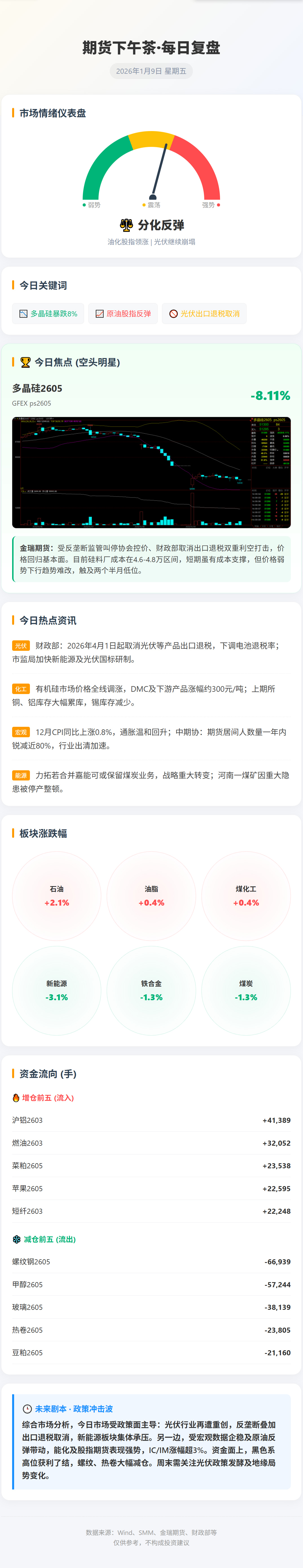 宏源期货认为,情绪与基本面同向共振,多头止盈离场,多晶硅市场情绪偏悲观,价格高位回落,短期来看,若情绪面没有较大转变,多晶硅或延续偏弱走势。后续持续关注政策端可能带来的情绪变动。