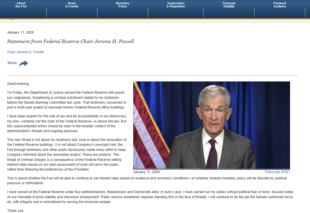 针对被刑事调查一事,以下是美联储主席杰罗姆·鲍威尔(Jerome H. Powell)于当地时间1月11日发布于美联储官网的声明全文:
